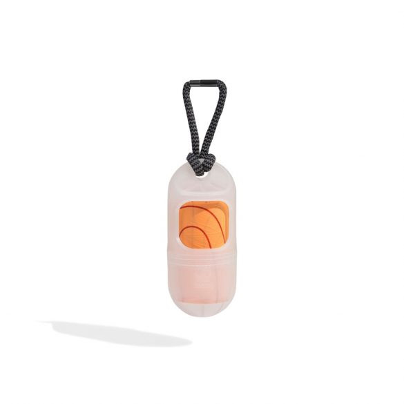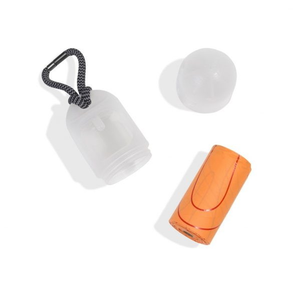 Praktikus, pórázra, táskára vagy övre akasztható, átlátszó műanyag kakizacsi tartó, egy rollni komposztálható, illatos kakizacsival.